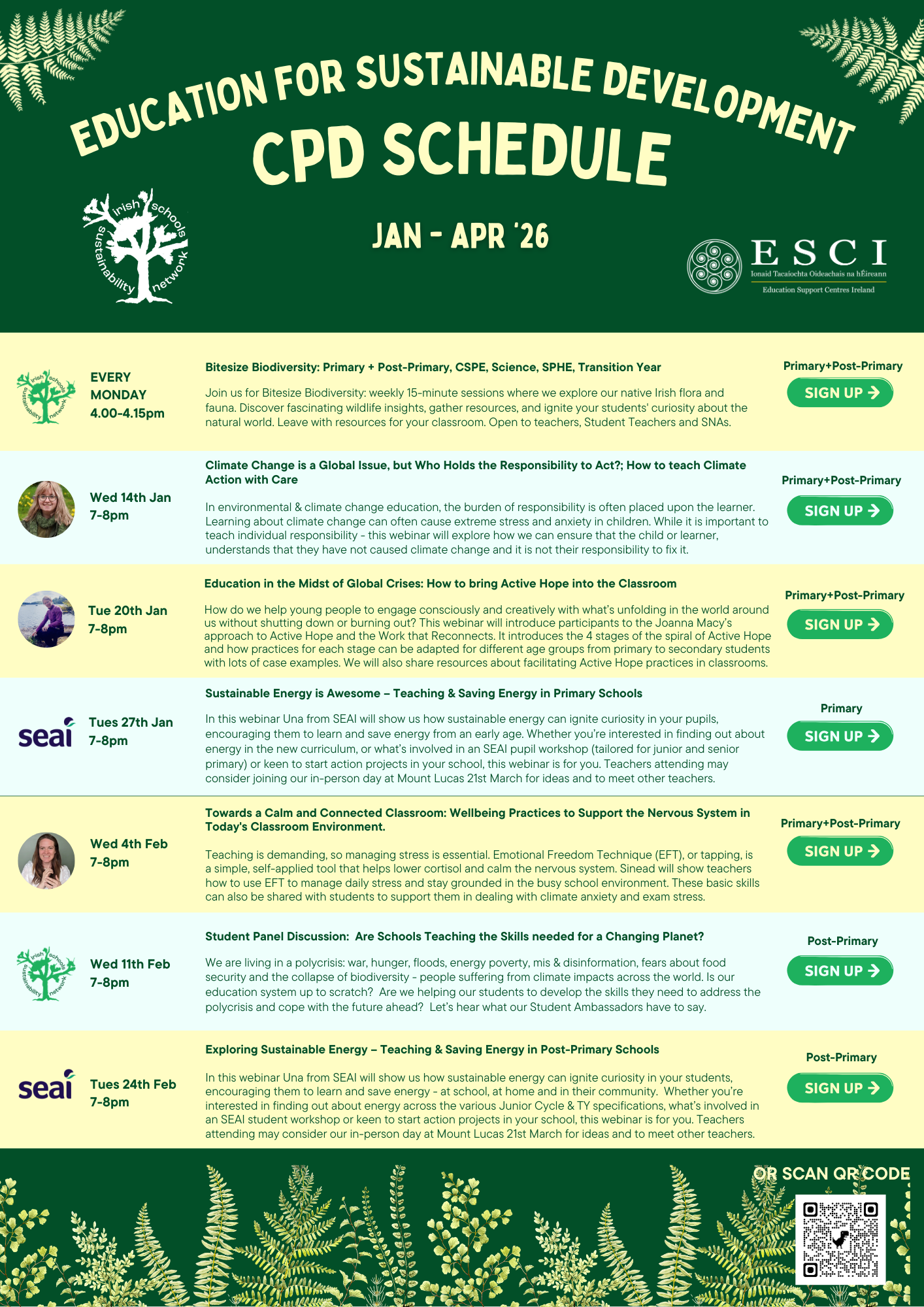 The sessions are designed to make it easier for Irish teachers to access professional development in the areas of climate and sustainability - topics that are more important than ever in our schools and communities. This collaboration aims to support and inspire educators as we work together to integrate sustainability into the classroom and beyond. Participants receive a CPD certificate upon completion.